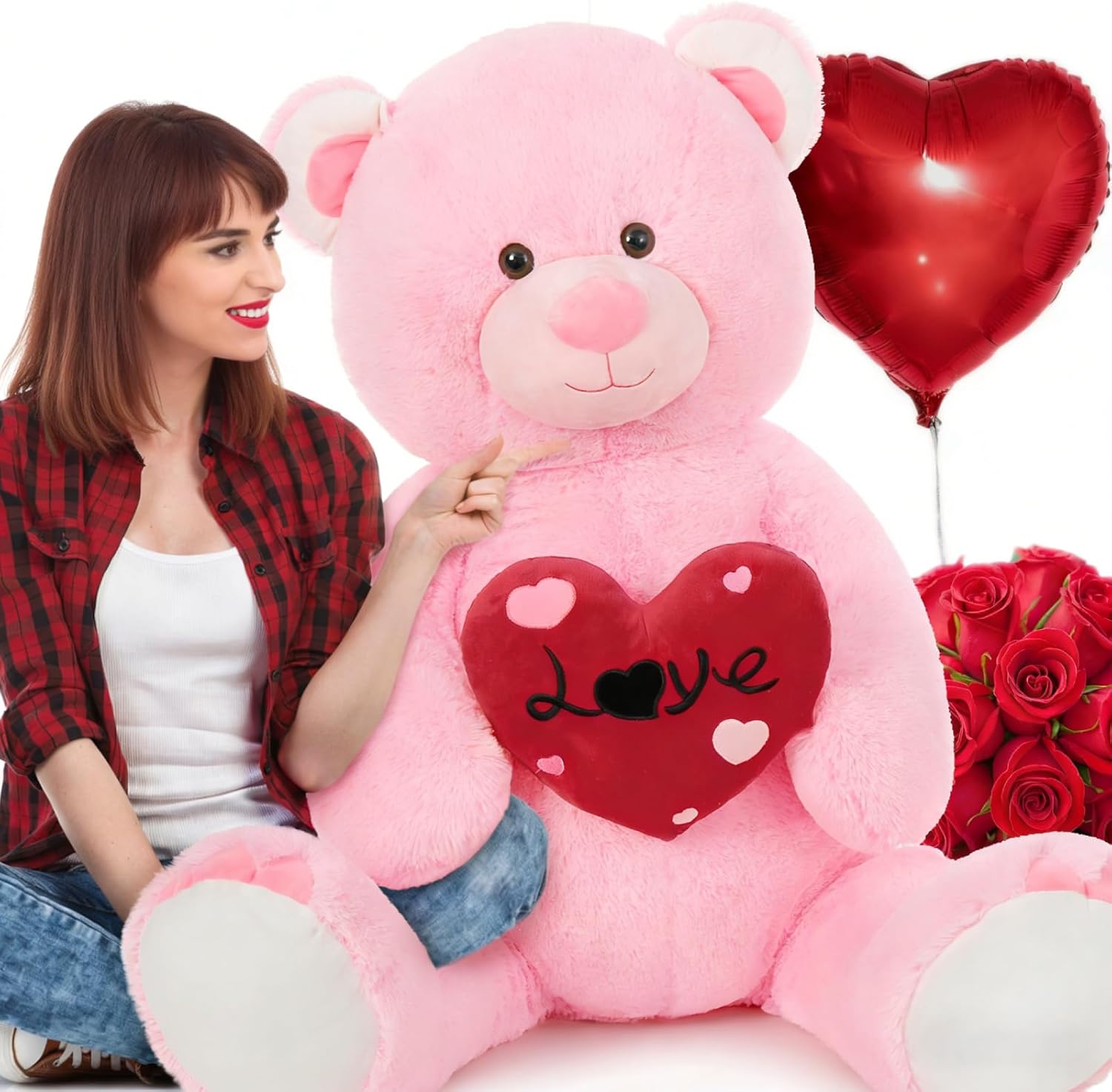 MaoGoLan’s giant pink teddy bear offers a soft, cuddly hug perfect for Valentine’s gifts. Made with plush material and a red heart pillow, it brings comfort and love to any girl or woman.